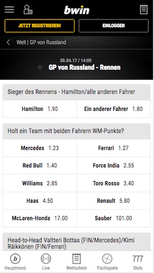 Während Sebastian Vettel bereits die Rennen in Bahrain und Melbourne gewinnen konnte, muss Lewis Hamilton nun beim GP von Sotchi zurückschlagen. Der Brite hat das Rennen bereits 2014 und 2015 gewonnen und hat eine 1.90-er Quote für den Sieg. Für jeden anderen Fahrer (Sebastian Vettel natürlich eingeschlossen) bietet dir bwin übrigens eine verlockende Quote von 1.80.