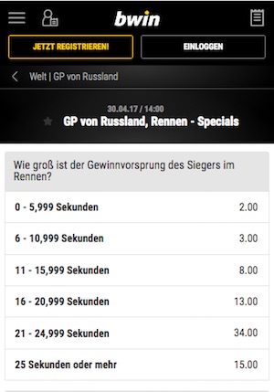 „Unser Job ist es, die Gegner weiterhin unter Druck zu setzen, vor allem Lewis Hamilton“, erklärt Sebastian Vettel im Vorfeld des Rennens. Man kann bei bwin darauf wetten, wie groß der Gewinnvorsprung des Siegers ist. Sollte der Sieger zwischen 0 – 5,999 Sekunden Vorsprung haben, dann liegt die Quote bei 2.00. Ist der Abstand aber zwischen 6 – 10,999 Sekunden so liegt die Quote bereits bei 3.00. Zum Vergleich: Nico Rosberg hat in der Vorsaison mit einem Vorsprung von über 25 Sekunden gewonnen. Dafür gibt es bei bwin eine Quote von 15.00 abzustauben. Wenn es dich interessieren sollte wie die weiteren Rennen nach dem GP von Sotschi aussehen, kannst du dir unseren Formel 1 Rennen 2017 ansehen. Dort findest du alle nützlichen Informationen.